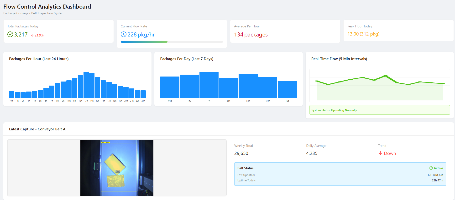See what's possible with Node-RED flows. This example dashboard demonstrates real-time analytics for a package conveyor belt system, the kind of monitoring you can build with your inspection flows.