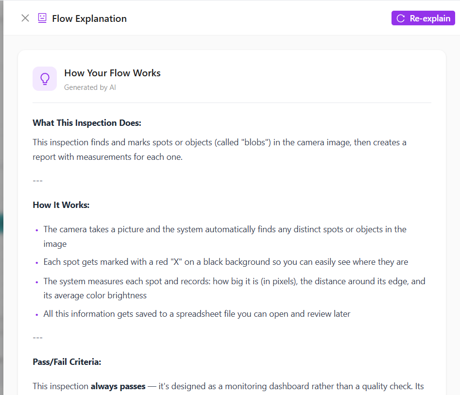 AI analyzes your flow and explains what each node does in plain English. Perfect for understanding complex flows built by others or documenting your own inspection logic.