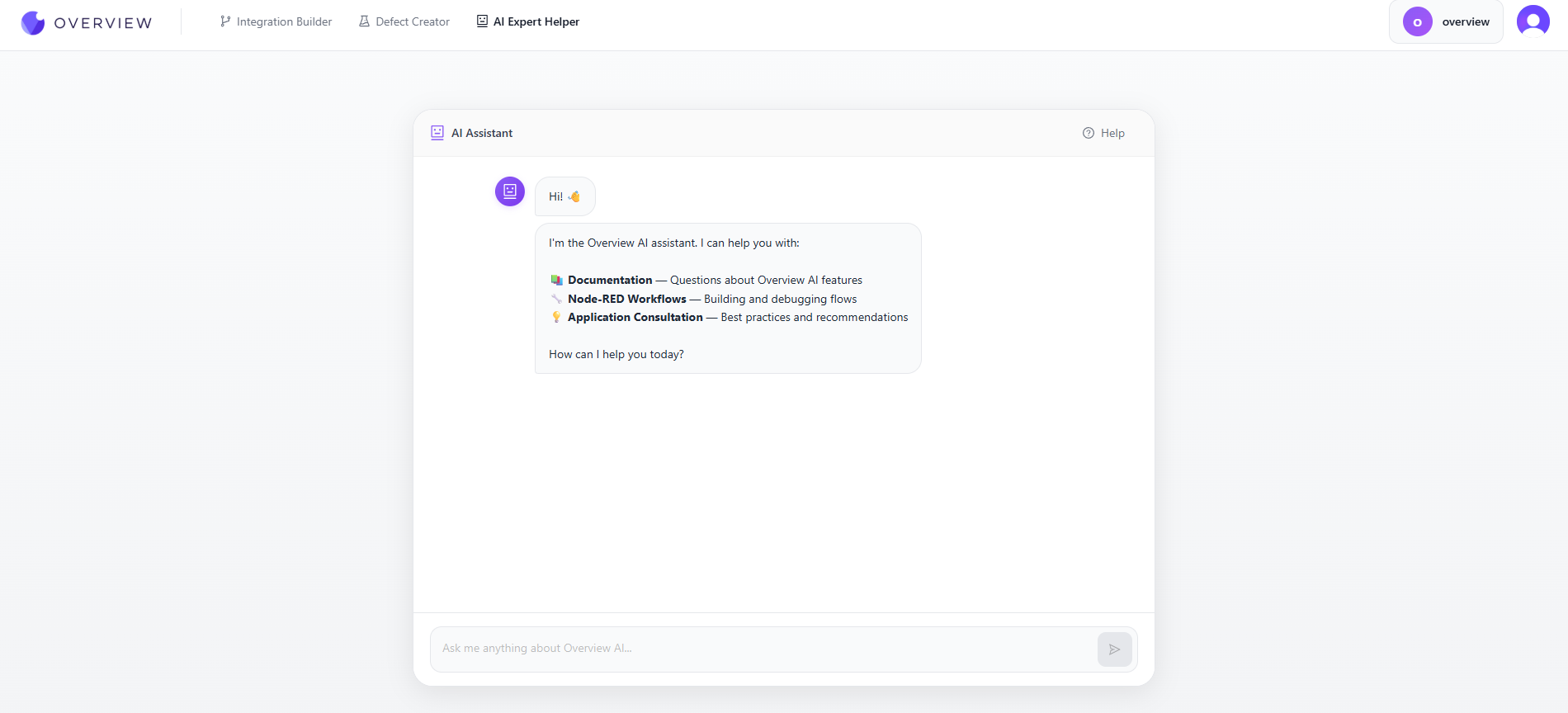 Ask questions about Overview AI features, get help building Node-RED workflows step by step, or receive personalized recommendations for your specific manufacturing application. The bot is trained on our complete knowledge base and available 24/7.