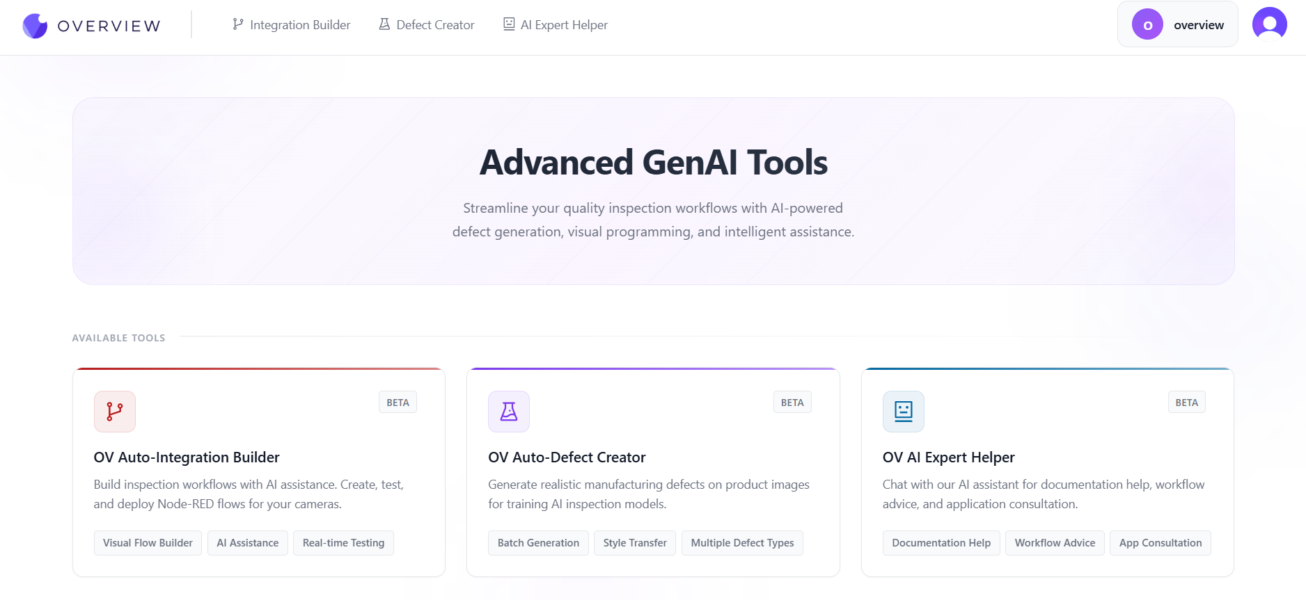 The Advanced GenAI Tools platform is a supporting ecosystem that sits alongside your Overview AI inspection cameras. It provides three powerful capabilities that address the biggest challenges in visual inspection deployment: